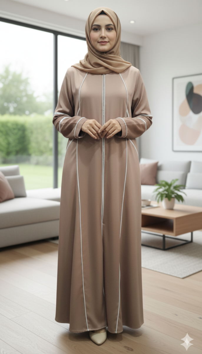 Step into timeless elegance with this beautifully crafted beige abaya, designed in premium Titkok fabric for a soft, flowy, and luxurious feel. The abaya features delicate piping design on the frontline, sleeves and shoulders, adding a subtle touch of charm to its classic silhouette. Finished with a sleek front piping detail, this piece is perfect for both casual outings and special occasions. Lightweight, comfortable, and graceful – a must-have addition to your abaya collection.